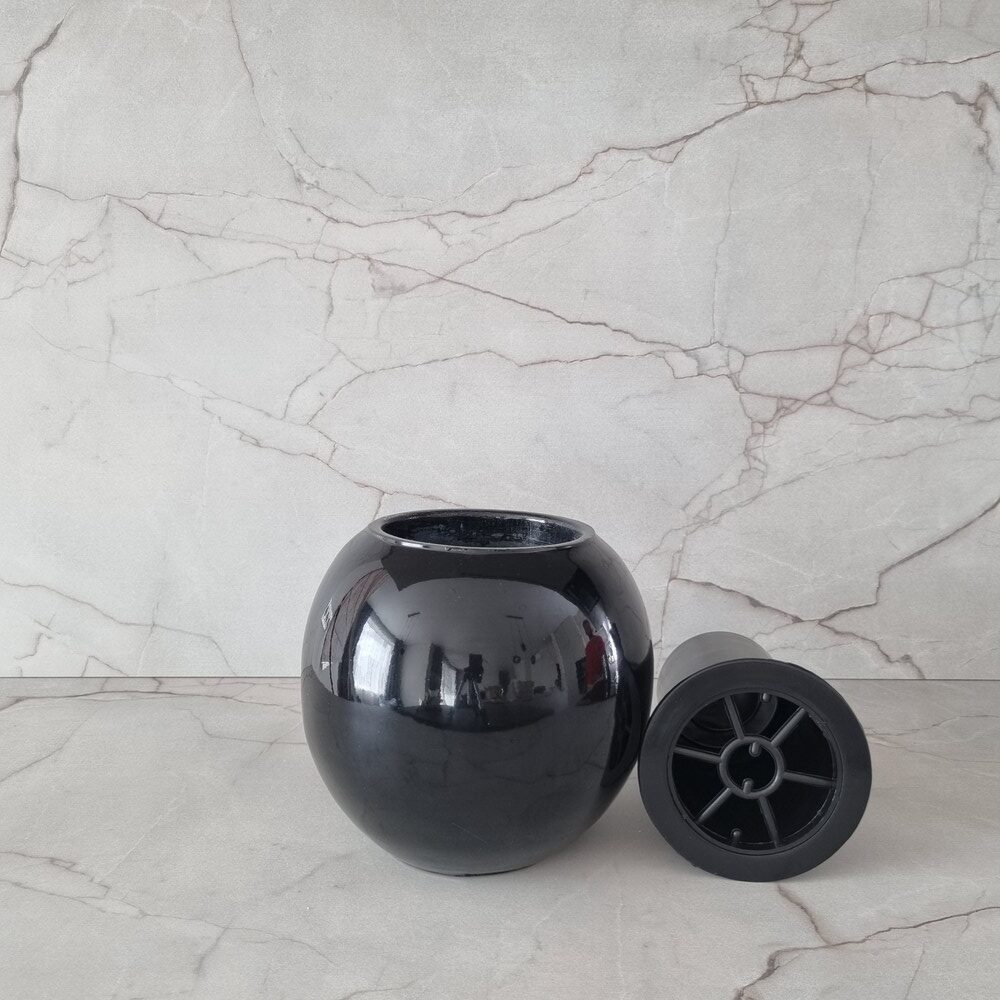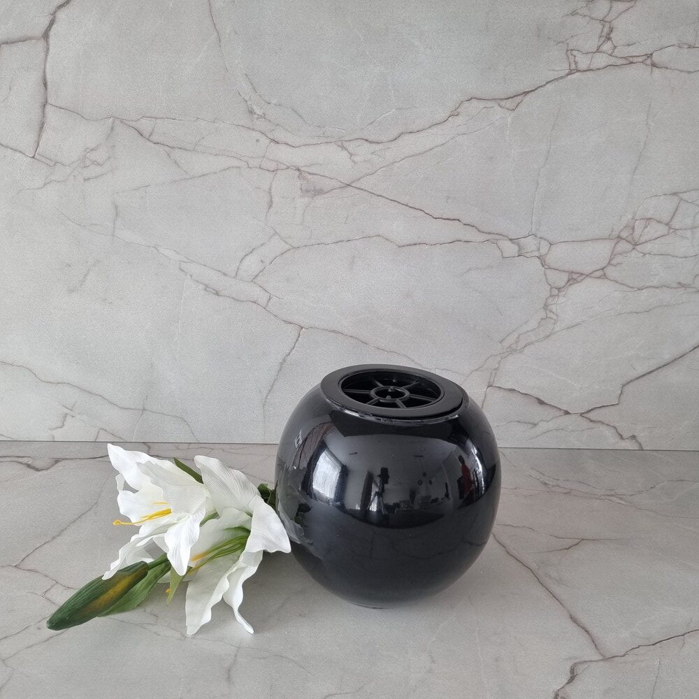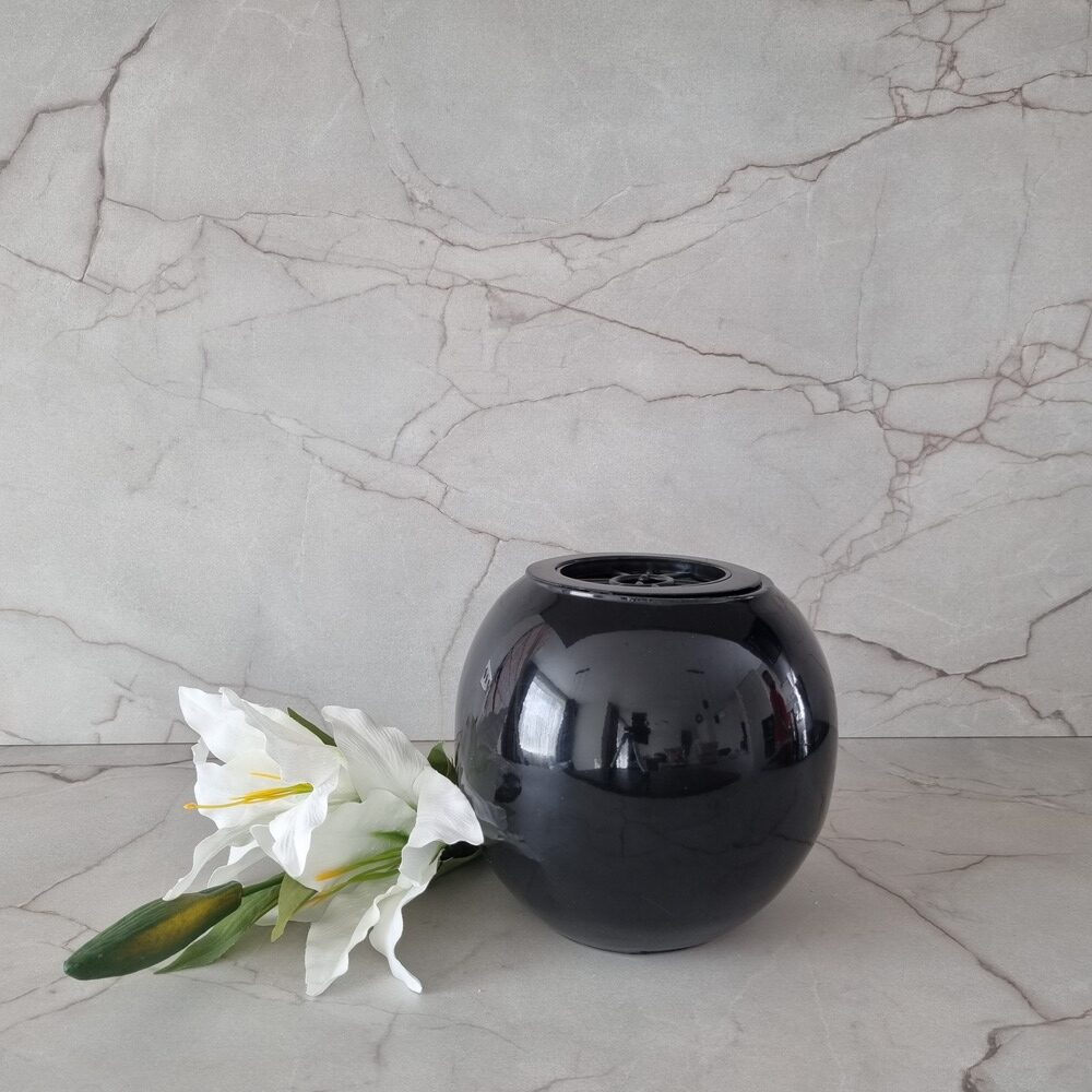 Aukštos kokybės, akmens masės kapų vaza „Apvali” tinkama lauko sąlygoms, atspari šalčiui, sniegui ir vandeniui. Juodos glazūruotos spalvos. Svoris yra apie 6 kg. Yra pakankamai sunki, kad kapų vazos nupūstų vėjas. Vaza turi plastikinį įdėklą, su grotelėmis gėlėms. Vazoje yra drenažinė anga vandeniui išbėgti, tai leidžia išvengti vazos skilimo žiemą.