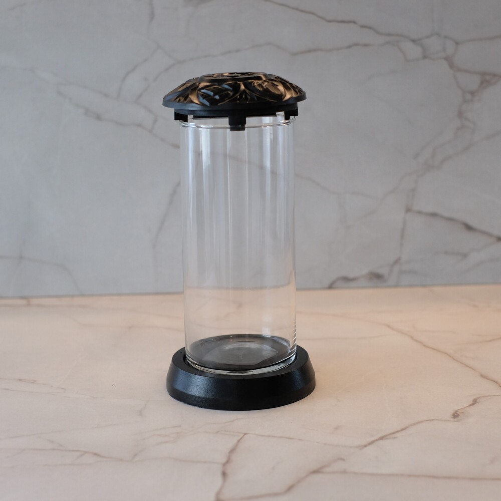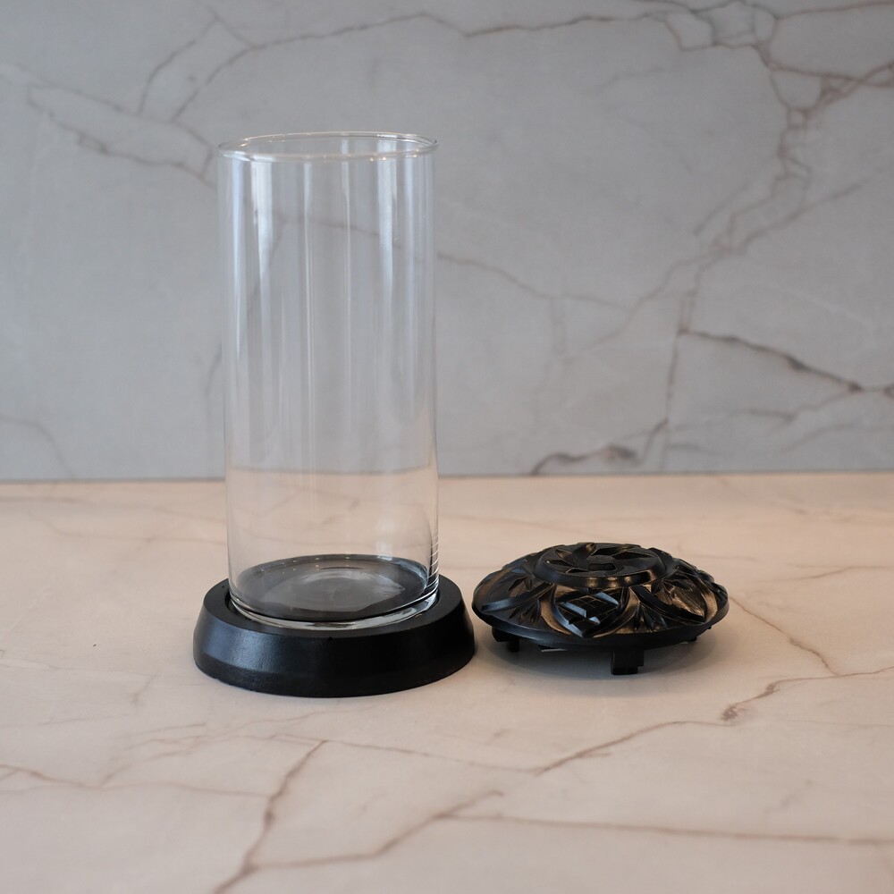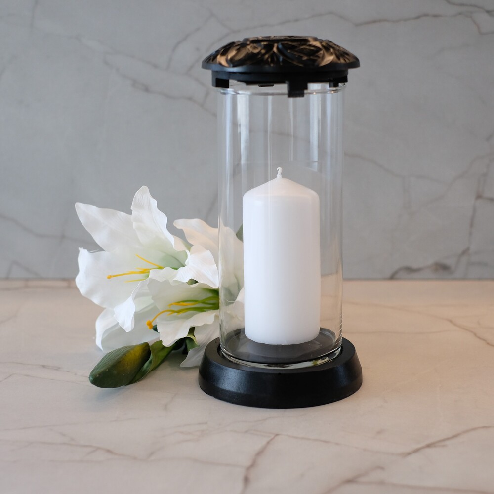 Aukštos kokybės, akmens masės žvakidė „Gėlės” cilindro formos, nuimamu viršumi. tinkama lauko sąlygoms, atspari šalčiui, sniegui ir vandeniui. Juodos spalvos. Svoris yra apie 1 kg. Yra pakankamai sunki, kad žvakidės nenupūstų vėjas. Žvakidė turi nukeliamą viršų, tai leidžia patogiai ir saugiai įdėti žvakę.