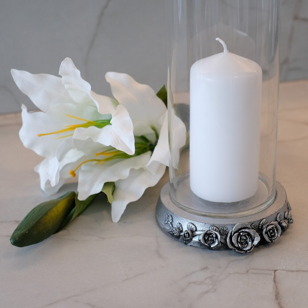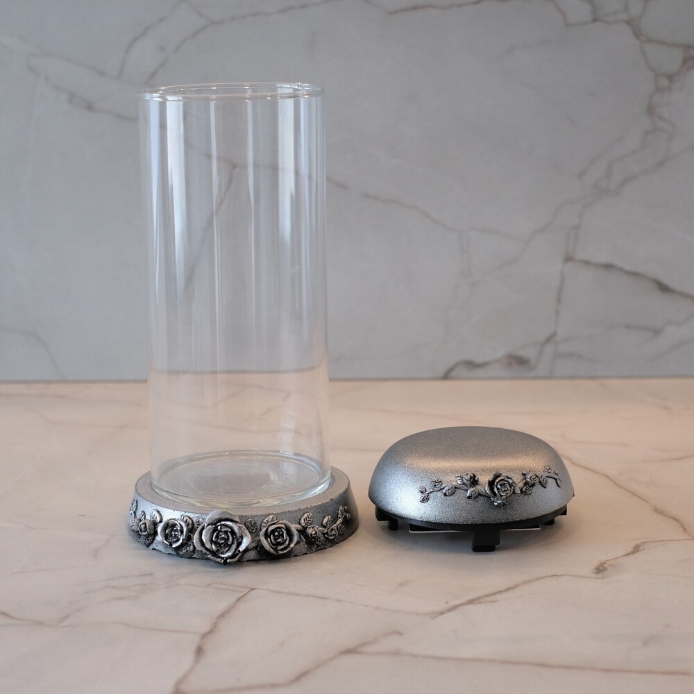 Aukštos kokybės, akmens masės žvakidė „Rožė” cilindro formos, nuimamu viršumi. tinkama lauko sąlygoms, atspari šalčiui, sniegui ir vandeniui. Žvakidės viršus ir apačia sidabrinės spalvos, pagrindas skaidrus. Svoris yra apie 1 kg. Yra pakankamai sunki, kad žvakidės nenupūstų vėjas. Žvakidė turi nukeliamą viršų, tai leidžia patogiai ir saugiai įdėti žvakę.